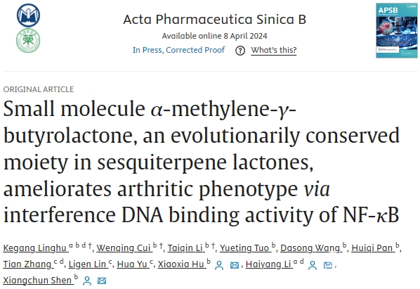 近日,药学院沈祥春教授与附属医院李海洋教授团队在天然倍半萜类小分子药物改善类风湿性关节炎研究方面取得新进展,相关研究以“Small molecule α-methylene-γ-butyrolactone, an evolutionarily conserved moiety in sesquiterpene lactones, ameliorates arthritic phenotype via interference DNA binding activity of NF-κB”为题发表于国际权威刊物《Acta Pharmaceutica Sinica B》(中科院1区药学TOP期刊,2023年最新IF=14.5)。
