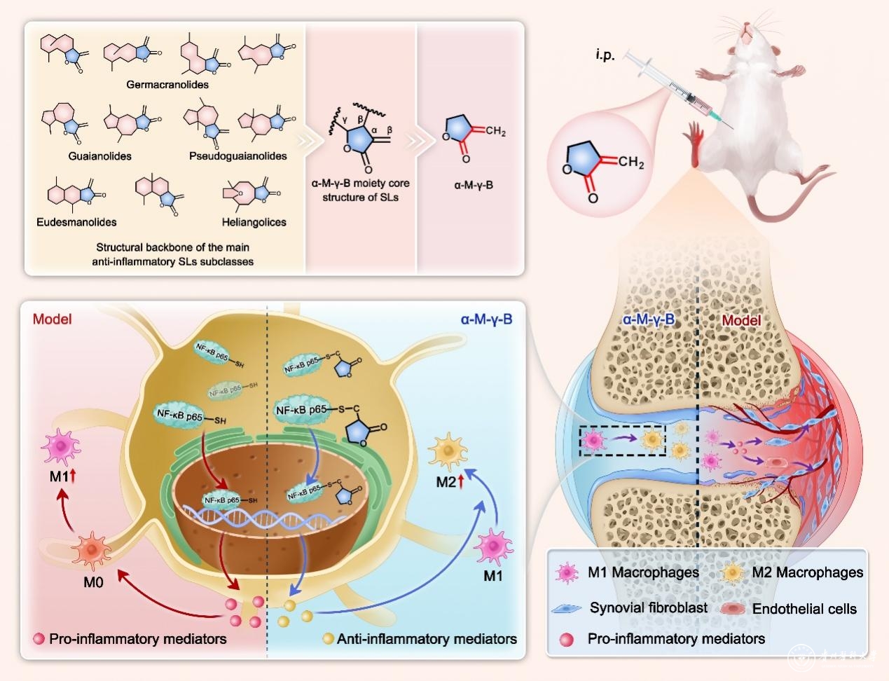 从前期研究中发现的一些实验现象和文献报道中受到启发,研究者系统总结了具有抗炎活性的SLs的主要骨架类型(包括吉马内酯,愈创木内酯,伪愈创木内酯,桉烷内酯和heliangolides等)并从中获得以下启发:大部分的抗炎SLs都包含一个α-亚甲基-γ-丁内酯(α-methylene-γ-butyrolactone,α-M-γ-B)核心结构,这表明α-M-γ-B可能在抗炎SLs中具有关键作用。受此启发,研究者获取了SLs结构简化的小分子α-M-γ-B和其他六种结构类似物。相较于其他几个类似物,α-M-γ-B表现出最强的亲电性和最强的体外抗炎活性。α-M-γ-B相较于常见的抗炎药物(阿司匹林、地塞米松等)具有更强的体外抗炎活性。研究者进一步证实α-M-γ-B通过调控巨噬细胞的极化状态改善滑膜微环境缓解小鼠关节炎表型。此外,研究者发现α-M-γ-B虽然不抑制核转录因子NF-κB的入核,但是α-M-γ-B可以直接靶向NF-κB p65上的半胱氨酸残基并干扰其与DNA的结合,进而发挥抗炎和RA治疗作用。