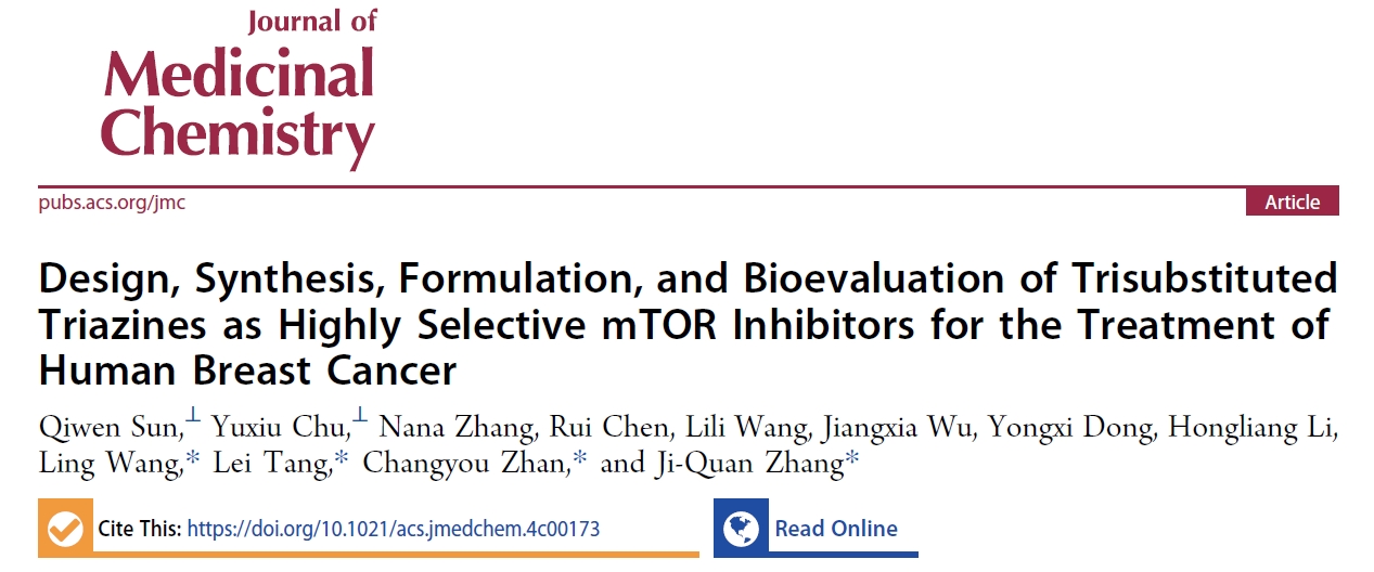 近日,beat365化学药工程中心汤磊/张吉泉团队在国际知名期刊《Journal of Medicinal Chemistry》(IF: 7.3,药物化学TOP1)上在线发表研究论文“Design, Synthesis, Formulation, and Bioevaluation of Trisubstituted Triazines as Highly Selective mTOR Inhibitors for the Treatment of Human Breast Cancer”。该研究采用基于结构的药物分子设计策略,以三期临床候选药物Gedatolisib(PT-1)为工具分子,通过结构改造筛选出高选择性mTOR抑制剂PT-88,该化合物具有较强的抗乳腺癌活性,有良好的临床开发前景。