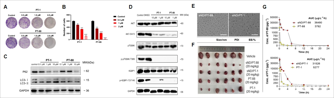 化合物PT-88对乳腺癌细胞株MCF-7具有较好的选择性和抗增殖活性(0.74μM),通过细胞克隆形成、划痕、周期阻滞、凋亡、自噬及信号通路抑制等实验考察了化合物的抗肿瘤机制。为改善优选化合物的药动学性质,课题组与复旦大学占昌友教授课题组合作,制备了PT-88及阳性对照PT-1的脂质纳米圆盘制剂(sND/PT-88和sND/PT-1)。结果显示,成制剂后PT-88的血浆暴露量提高了近10倍,半衰期及最大血药浓度均显著改善。值得注意的是,制剂同时极大地提升了化合物的体内耐受剂量(MTD)。BALB/c裸鼠药效学研究显示,20 mg/kg剂量给药后(i.v., QOD´10),sND/PT-88给药组的肿瘤生长抑制率(TGI)达到64.1%,显著优于sND/PT-1(55.9%)及游离药物PT-88组(45.6%),且具有较好的体内安全性。