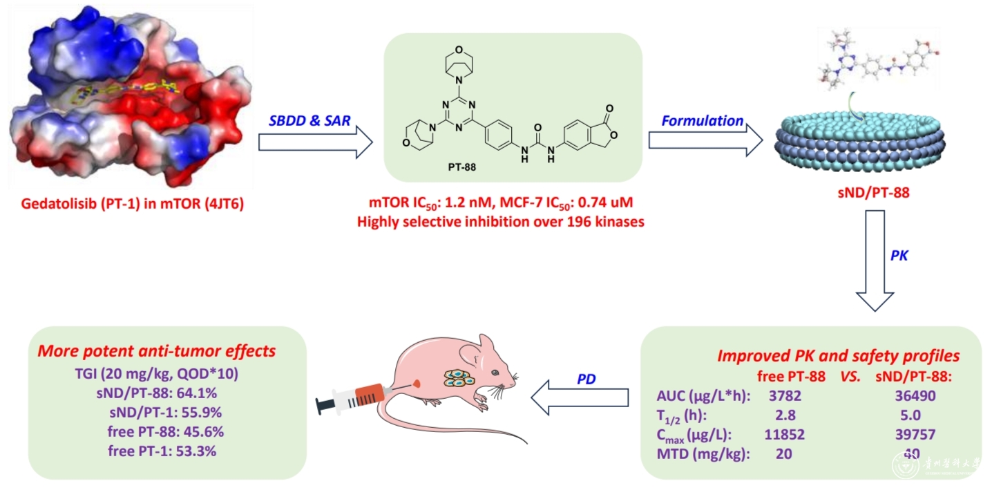 该研究通过基于结构的药物分子设计策略,成功筛选出高活性与选择性mTOR抑制剂PT-88,化合物已获发明专利授权保护(ZL202210435526.7)。研究为基于mTOR激酶的创新药物研究提供了新的工具分子,也为候选药物分子进入临床评价提供了新的研究范式。
