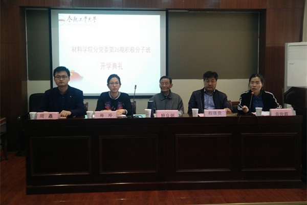 4月5日下午,九游体育官网分党校第26期积极分子班开学典礼在材料楼601会议室隆重召开。校关工委“五老”报告团副团长鲍良弼老师、九游体育官网党委书记程继贵老师、九游体育官网党委副书记、副院长杨玲老师、分党校积极分子班班主任及本期全体入党积极分子参加了开学典礼。