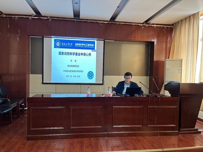 本次会议邀请到中科院固体物理研究所李越研究员做了精彩报告,李越研究员结合实际情况,介绍了选题的关键并就如何凝练核心科学问题等做了详细阐述,并结合研究目标与内容、研究方法与技术路线等方面分享了基金申请的成功经验和写作技巧,给在场的老师们提出了很多非常中肯的建议并进行了答疑交流。