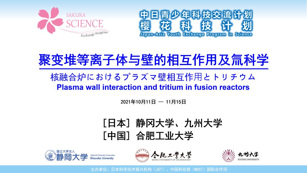 为推动九游官网与日本高校之间的科技交流与合作,在中国科学技术部(MOST)国际合作司和日本科技振兴机构(JST)的支持下,九游官网与日本静冈大学、九州大学在2021年10月11日至11月15日联合举办了2021年度“中日青少年科技交流计划(樱花科技计划)”线上交流活动。本次活动以“聚变堆等离子体与壁的相互作用及氚科学”为主题,围绕未来聚变装置中的材料与等离子体物理等关键科学技术问题,通过专题报告、研讨会、虚拟参观等形式开展了一系列线上交流。此次活动分为六个场次,中日相关学科教授、研究人员和科研团队等170余人次参加。