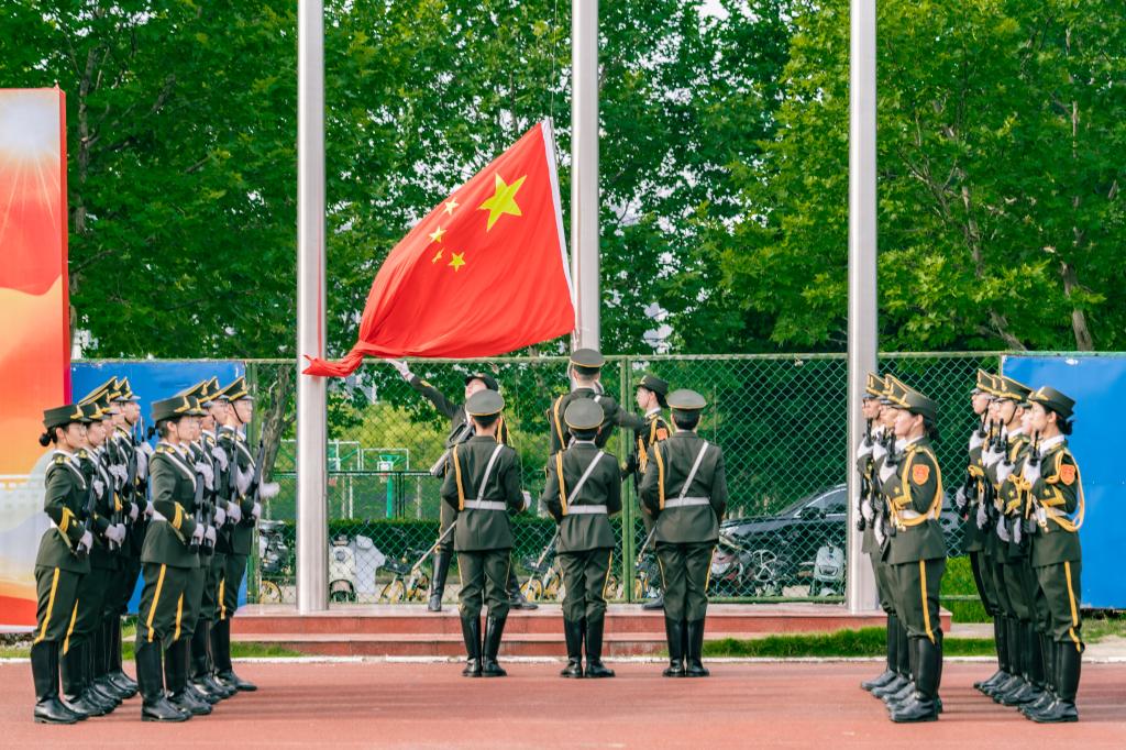 迎着第一缕晨曦,英姿飒爽的国旗护卫队护送着五星红旗,迈着铿锵的步伐走上升旗台。伴随着《义勇军进行曲》激昂的旋律,五星红旗冉冉升起、迎风飘扬。全体党员同学庄严肃立,向国旗行注目礼,齐唱国歌。
