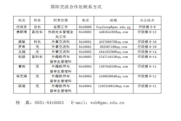 贵阳医学院国际交流合作处是贵阳医学院执行涉外政策、协调国际交流与合作事务的职能部门和办事机构,主要职责包括:起草全校国际合作工作的发展规划;协调全校外事活动,为院系部的教学、科研和国际学术交流提供信息和联系服务;负责重大外事接待活动及校级出访活动的策划及实施;拓展学校与海外高校、科研机构的合作项目,并负责校际交流计划的统筹管理,包括计划的制定、协议的拟订、交流项目的实施和运转情况的跟踪管理、服务;负责贵阳医学院各级各类学生海外交流项目的统筹规划和协调管理;归口管理全校各类外国留学生、交换学生和研究学者、交流学者,包括发展规划的制订、招生录取、外事和教学管理、生活服务、经费管理、国际校友联络等业务;归口管理各类来华外国专家的聘请、报批、外事和生活管理等事务;中外合作办学的联络、审核和报批;教职工和学生出国申报,以及教职工/学生因公出国护照、签证的办理;学校交办的其他各项国际合作交流事务。