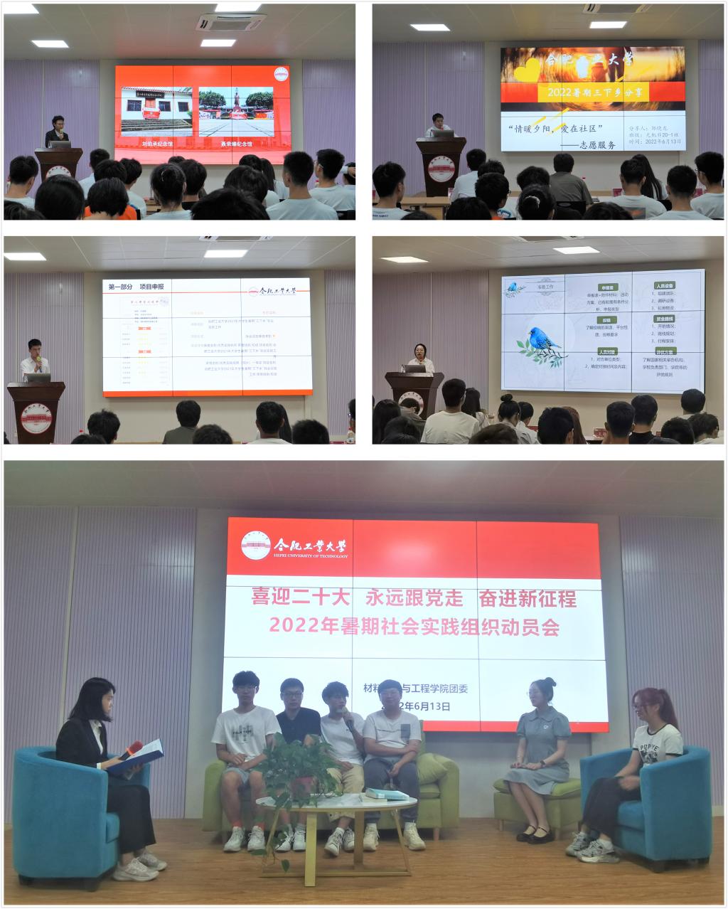 “以将心守初心,以无悔致青春”暑期社会实践团队负责人、社会实践优秀标兵王业翔介绍了他们赴湖南、重庆等地寻访彭德怀、罗荣桓、聂荣臻和刘伯承等将帅故居,追寻“将心”,缅怀革命先烈,传承红色精神的生动实践故事。“凝聚青春力量,助力乡村振兴”暑期社会实践团队负责人、社会实践优秀标兵王家辉分享了他们走访调研九游官网选调生代表王萌萌、张铁鑫、戴迎春、圣玉祥等人助力脱贫攻坚和乡村振兴中的生动实践。“童心向党,七彩假期”暑期社会实践团队负责人周文韬讲述了他们围绕思想引领、文明生活、身心健康、科技创新、快乐学习、艺术素养、文化传承等方面开展支教故事。“情暖夕阳,爱在社区”暑期社会实践团队负责人邹晓龙讲述了他们赴合肥市经开区芙蓉社区开展关怀空巢老人实践故事。赴苏皖地区材料行业考察调研团负责人王语韩讲述了他们走访材料类企业的见闻感悟,号召同学们砥砺工业报国情怀。