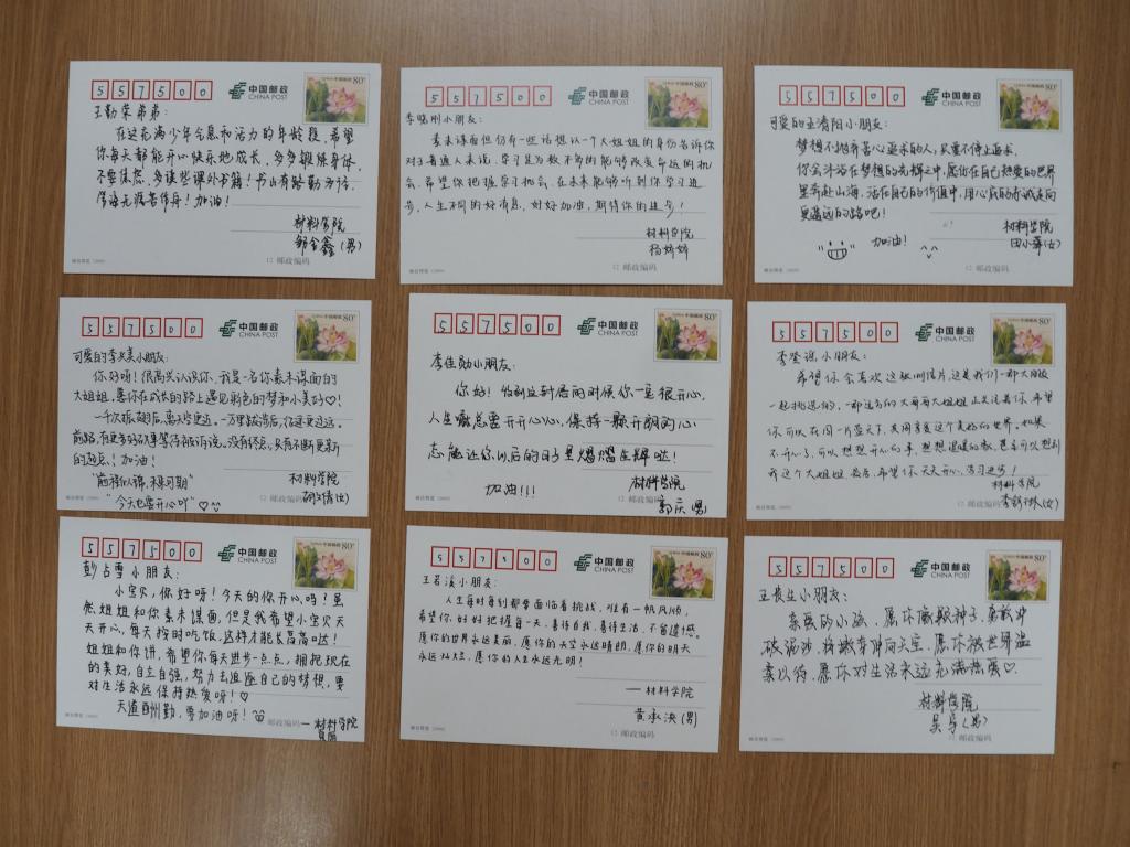 4月13日,学院研究生会成员和材物化研究生党支部的党员们齐聚九游体育官网小红楼103,为长青第二小学五年级(2)班的27名小学生精心挑选九游体育官网主题的明信片,并认真书写了对孩子们想说的话,为孩子们送去美好的祝福。有的同学们讲述了最近学习生活中的趣事,有的同学描绘了工大校园的美丽景色,有的同学分享了大学生活的美好……在明信片的最后,大家不约而同地写下了对丹寨孩子们的鼓励与祝福,希望他们能够健康快乐地成长。此外,学院还为山区小朋友们准备了学习工具大礼包,在精神上给予鼓励的同时,也为小朋友们送上最需要的物资,帮助他们更好的求学与成长!