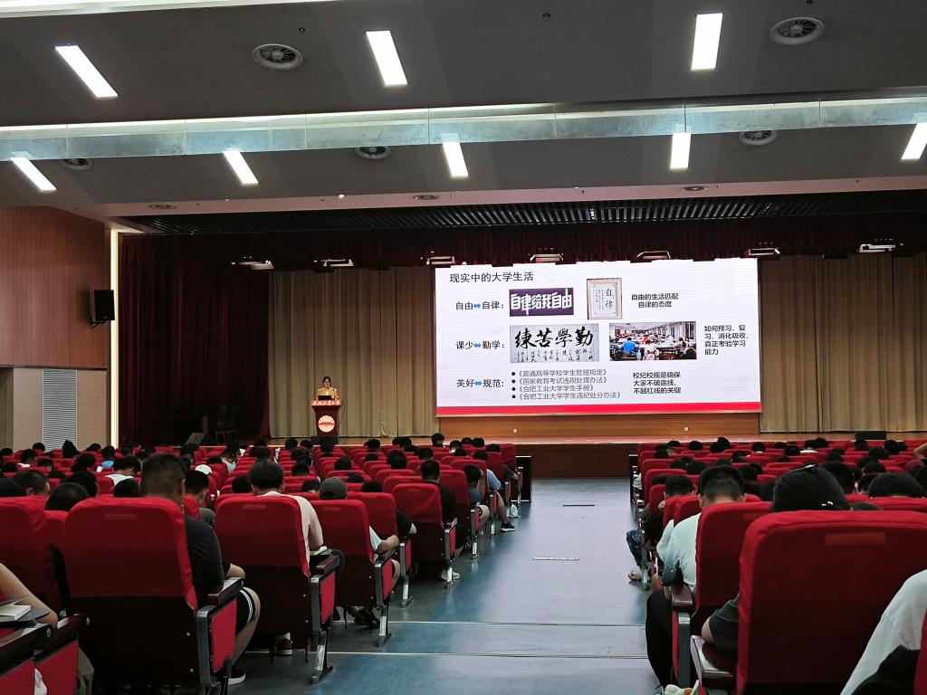 本次宣讲涉及入学适应、学校简介、成长发展、心理健康、职业规划等多个教育模块,内容丰富有趣。校入学教育宣讲团老师为同学们作宣讲。她从中学到大学的角色转换开讲,首先带同学们全面认识学校和合肥市的基本情况,随后详细介绍了工大校园生活指南,同时强调了大学学习方法和高中的不同,引导同学们树立正确的学习观,总结好高效的学习方法,最后希望同学们精准认知,在不断的专业学习中建立职业规划。