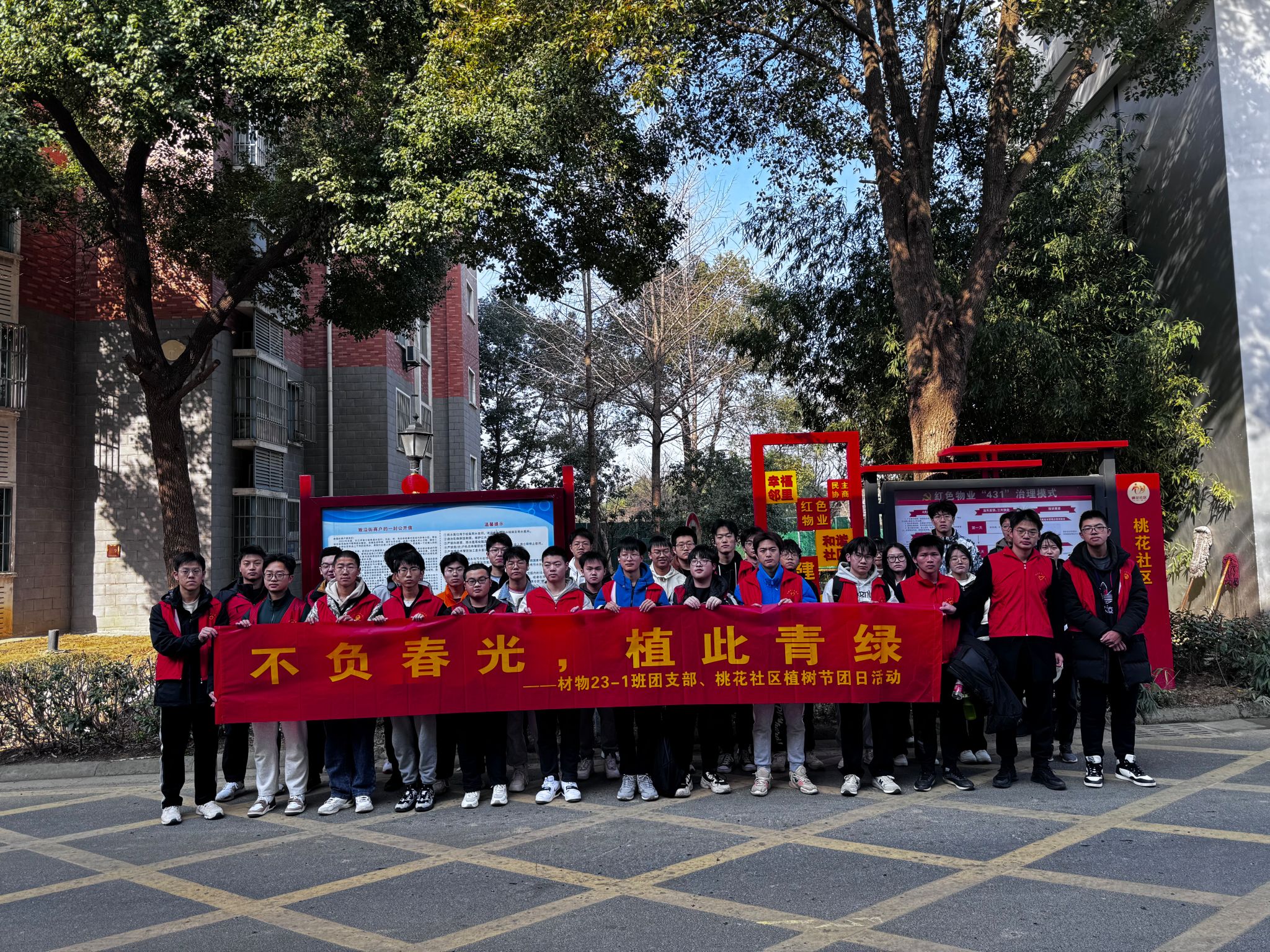 三月春光好,植树正当时。在第46个植树节来临之际,为提高同学们的环保意识与劳动热情,3月10日上午,九游体育官网组织材料物理23-1班团支部赴桃花社区开展“不负春光,植此青绿”植树节主题团日活动,材料物理23-1班全体同学参与此次活动。