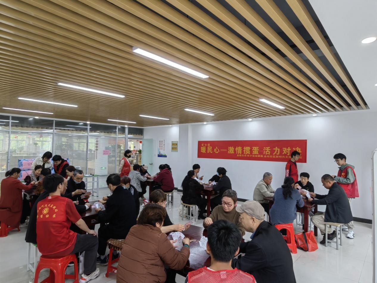 当天下午,志愿者们在社区工作人员的安排下,协助组织了一场“暖民心—激情掼蛋 活力对决”掼蛋比赛。比赛共分为初选和决赛,每局比赛时间为40分钟,根据每组的晋级情况决定胜负。参赛的老年居民们两两自由组队,12支队伍通过抽签组成6桌,展开了激烈的对决。比赛过程中,选手们不仅配合默契,还能敏锐地嗅知对手的“杀招”,见招拆招,攻其不备,出其不意。现场氛围紧张激烈,老年居民们兴致高昂,充分展示了他们的智慧和技巧。志愿者们作为裁判,公正公开,如实记录了每支队伍的战绩。最终,经过激烈的角逐,前三名团队脱颖而出。 在颁奖环节,志愿者为获奖选手颁发了精心准备的奖品,并向他们表示祝贺。