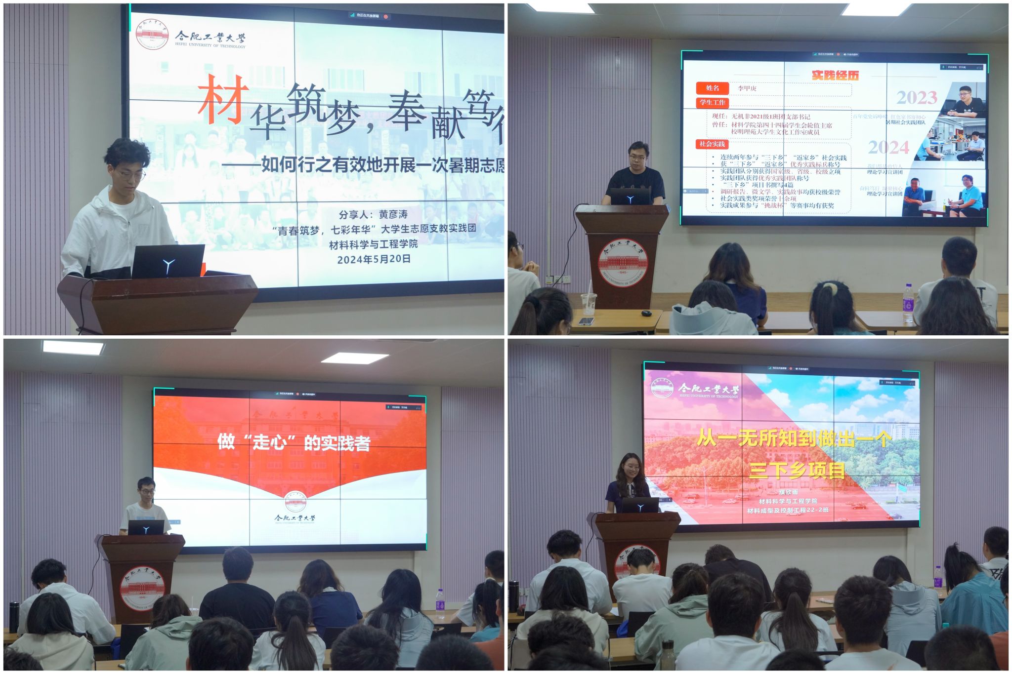 五位代表分别介绍了项目选择、团队申报、策划撰写、宣传报道、成果转化等,讲解详实,干货满满。分享内容涵盖七彩支教、红色文化调研、农业乡村振兴、理论实践宣讲等,为同学们申报、开展三下乡暑期实践提供了新思路。学院团委负责老师最后做了三下乡活动动员,鼓励同学们积极参与到本年度三下乡社会实践中来,把握时代面临课题、国家发展的方向,自觉肩负起使命担当,发挥所长,为社会多作贡献。