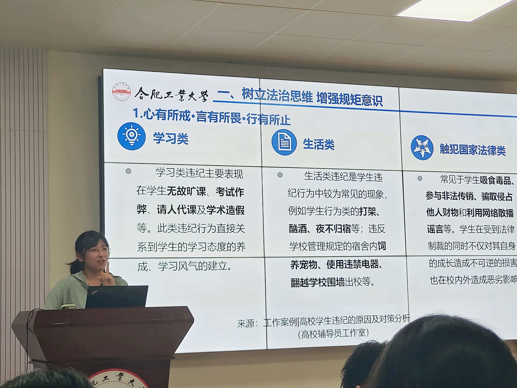 班会中,辅导员带领学生认真学习学校学生教育管理相关文件政策,并结合相关政策罗列校内外典型违纪违规案例,对于违纪违规行为的思想根源、集体危害和严重代价进行分析,警示学生应以案为鉴,引以为戒,树立底线思维,常思自身不足、常敲自警之钟;倡导学生践行校园、教室、宿舍、餐厅、网络五个文明,从小事做起,争做时代有为青年。