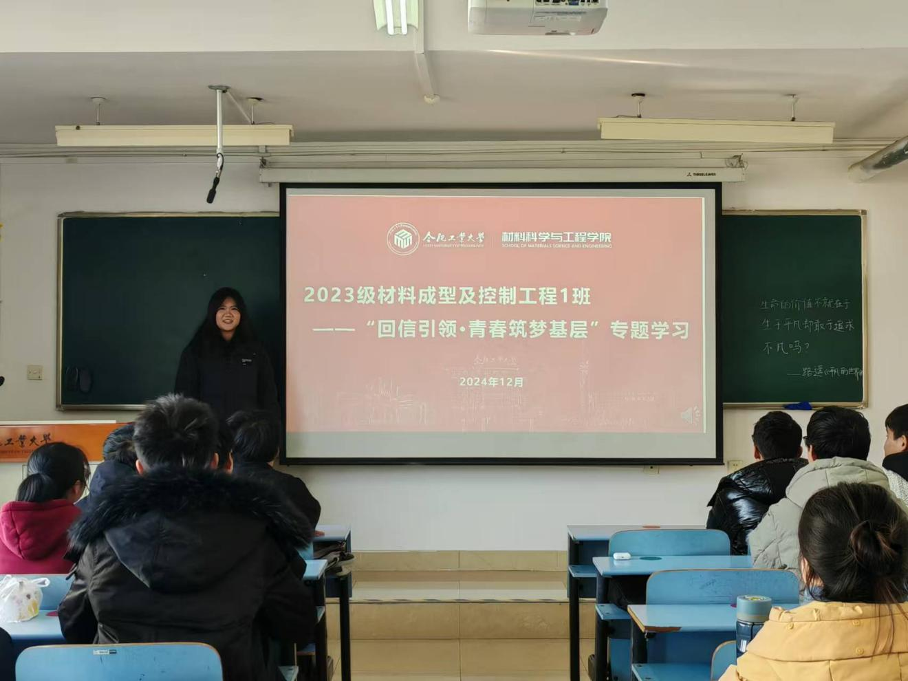 12月24日上午,九游体育官网组织材料成型及控制工程2023级1班团支部开展了主题为“回信领航·青春筑梦基层”的特色团支部活动。支部青年全部参与了本次团日活动。
