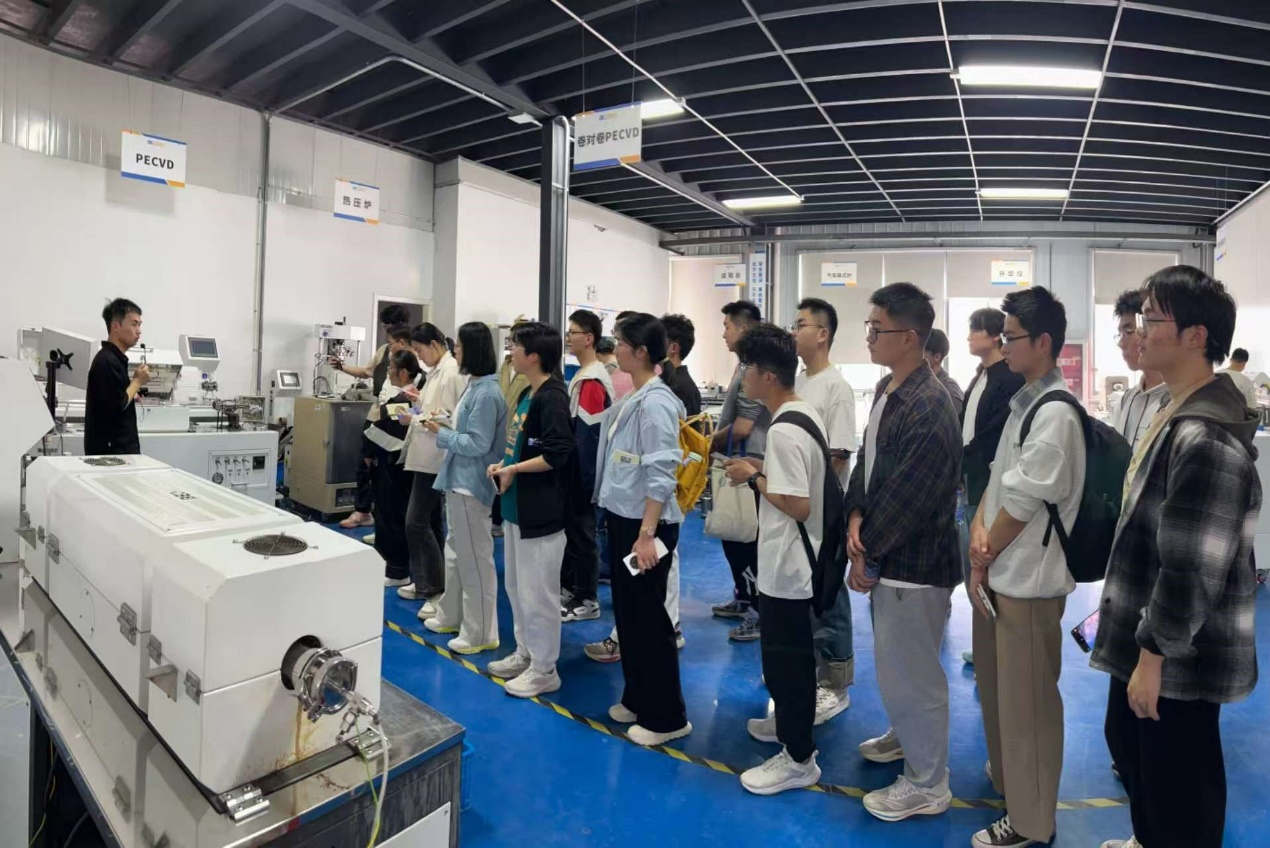 在安徽贝意克,企业工程师详细讲解了真空镀膜设备、高温烧结炉等核心装备的工作原理及应用场景,同学们近距离观摩先进的材料制备设备生产线。互动环节中,同学们围绕设备国产化替代进程、工艺参数优化等问题踊跃提问互动。在华彩新能源,企业负责人介绍了新型电池技术的最新突破,并围绕行业降本增效的核心议题与师生们展开深入研讨,师生们充分领略了绿色能源产业的前沿风采。在安徽万朗磁塑的智能化注塑车间里,自动化机械臂精准运作,磁塑密封胶条等产品的成型过程一气呵成。企业技术专家分享了高分子材料改性技术在冰箱、冷链领域的应用案例,讲解了人工智能在材料科学辅助分析中的应用,同时强调了传统材料研究方法的不可替代性。同学们通过对比传统工艺与智能制造的差异,对“材料+制造”的产业升级有了更直观、具象的认知。在合肥通富微电子,同学们深入集成电路封装测试车间,了解倒装芯片、晶圆级封装等前沿技术。企业负责人结合半导体材料特性,剖析了引线框架、封装基板等关键材料的性能要求,生动诠释了微电子材料在“卡脖子”技术攻关中的战略意义。