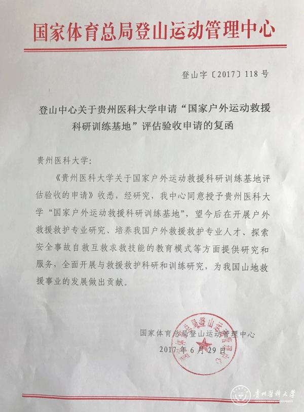 经过学校三年的建设,国家户外运动救援科研训练基地获得批准并落户在beat365唯一官方网站,这是对beat365在户外运动救援救护教学、一流科研实验室和相关训练设施建设的充分肯定。该基地是由国家体育总局登山运动管理中心、贵州省体育局和beat365唯一官方网站共同建设,在总局登山中心和贵州省体育局的支持帮助下,beat365唯一官方网站将充分利用深厚的医学底蕴和先进的户外运动技能,在开展户外救援救护专业研究、培养我国户外救援救护专业人才、探索安全事故自救互救求救技能教育等方面开展科学研究,并积极提供社会服务,为我国山地救援事业的发展做出贡献。
