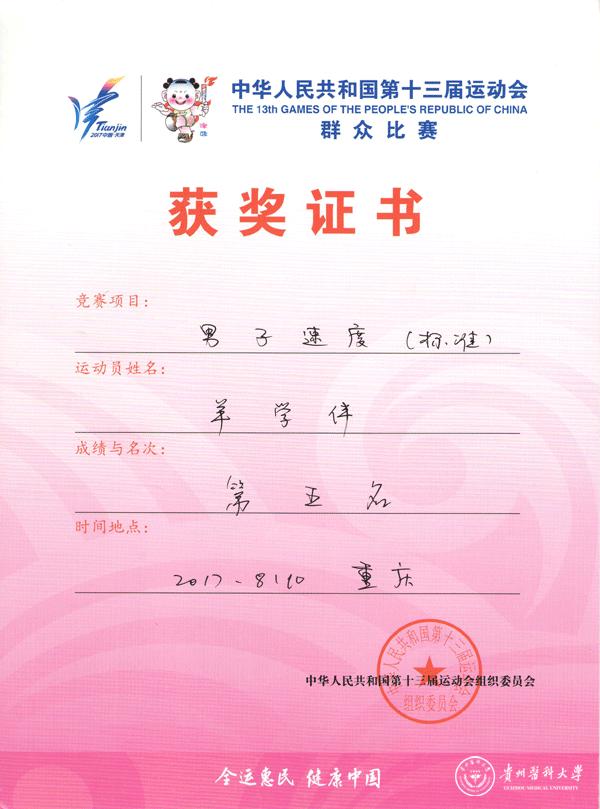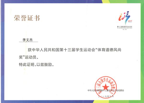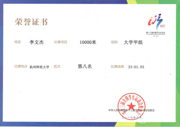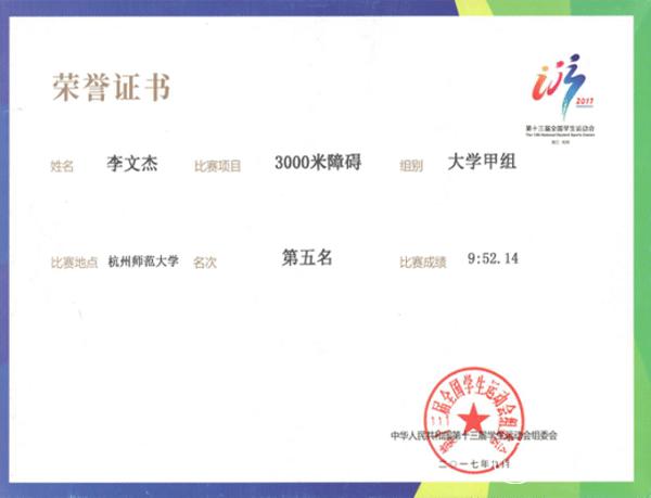 9月3日,第十三届全国学生运动会在杭州举行。9月11日晚上七点,大学男子甲组万米决赛中,beat365运动与健康学院2014级休闲体育专业学生李文杰,获得第八名;9月12日晚七点,大学男子甲组三千米障碍赛决赛中,李文杰同学取得第五名的好成绩,再次为贵州代表团争得了田径项目的荣誉,他个人也获得“体育道德风尚”运动员荣誉称号。