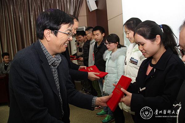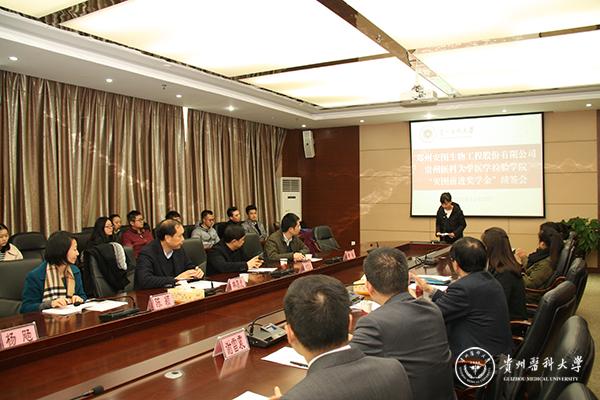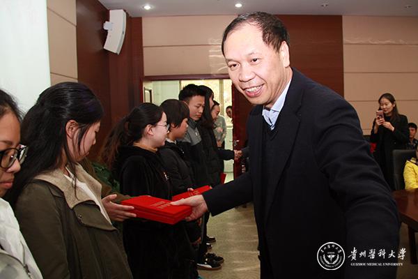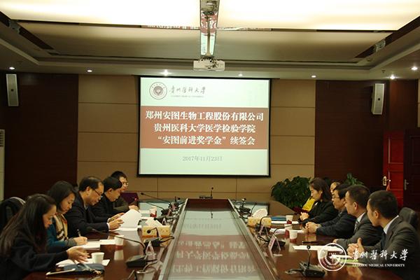 11月23日,安图前进奖学金续签仪式在beat365举行。全国政协委员、农工党河南省委专职副主委花亚伟、安图生物公司营销总监谢雷震,校党委书记林昌虎,农工党贵州省委副主委、贵州省卫生发展研究院常务副院长喻国冻,校党办、医学检验学院等负责人出席仪式。