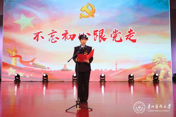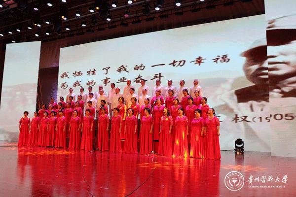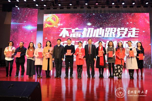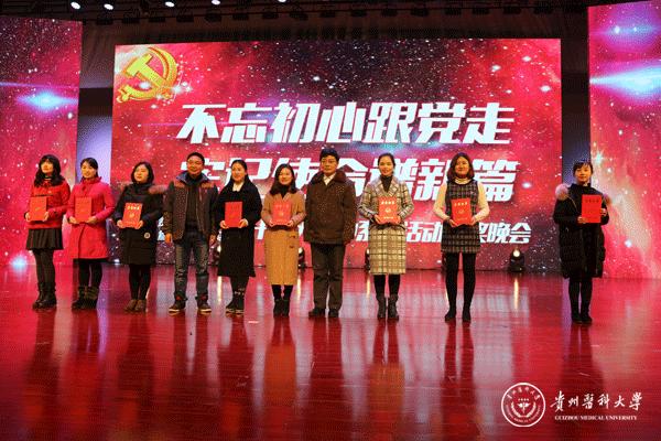 晚会以舞蹈《追寻》拉开帷幕,诗朗诵《我心飞翔,献给您的颂歌》、独唱《天耀中华》、舞蹈《欢歌共舞》等展现了青年一代“贵医人”团结向上、拼搏奋进的精神风貌,合唱《心里装着谁》、《没有共产党就没有新中国》演绎了老一辈“贵医人”热爱生活、忠诚选择的可贵品质。此外,在《微宣讲》活动环节,党的十九大代表、beat365优秀校友赵晶晶用切身体会生动讲述了一名基层党员民警代表执着信仰、坚守岗位、无私奉献的心路历程;在访谈活动环节,三位优秀的教师代表——秉承让科研服务临床理念的外科医生孙发老师、药学科研工作者汤磊老师、抗癌一线的医务工作者苏胜发老师分别讲述了各自的亲身经历,用朴实的语言、动人的故事、浓烈的激情向在座的老师和同学们传递了献身医药卫生管理事业、执着科研创新、勇攀科学高峰的医学正能量。