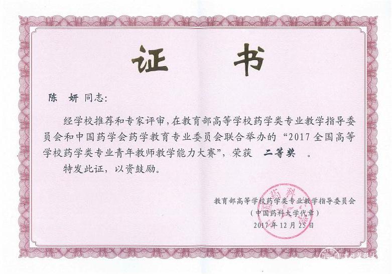由教育部高等学校药学类专业教学指导委员会和中国药学会药学教育专业委员会联合举办的2017全国药学院校教学学术“钟山论坛”暨高等学校药学类专业青年教师教学能力大赛决赛于12月24日-26日在南京举行。来自中国药科大学、复旦大学药学院、四川大学华西药学院、浙江大学药学院等全国43所药学院校的教师,分为药理组、药剂组、药物分析组和药物化学组四组。beat365药学院沈祥春教授应邀担任决赛评委。药学院中药药理学教研室陈妍教授参加药理组的比赛,经过激烈角逐,最终在本次大赛中取得了“2017全国高等学校药学类专业青年教师教学能力大赛二等奖”。这是beat365首次参与教育部药学教学指导委员会组织的全国药学类青年教师大赛,对提升beat365药学教育的影响力,提高青年教师的教学能力具有促进作用。