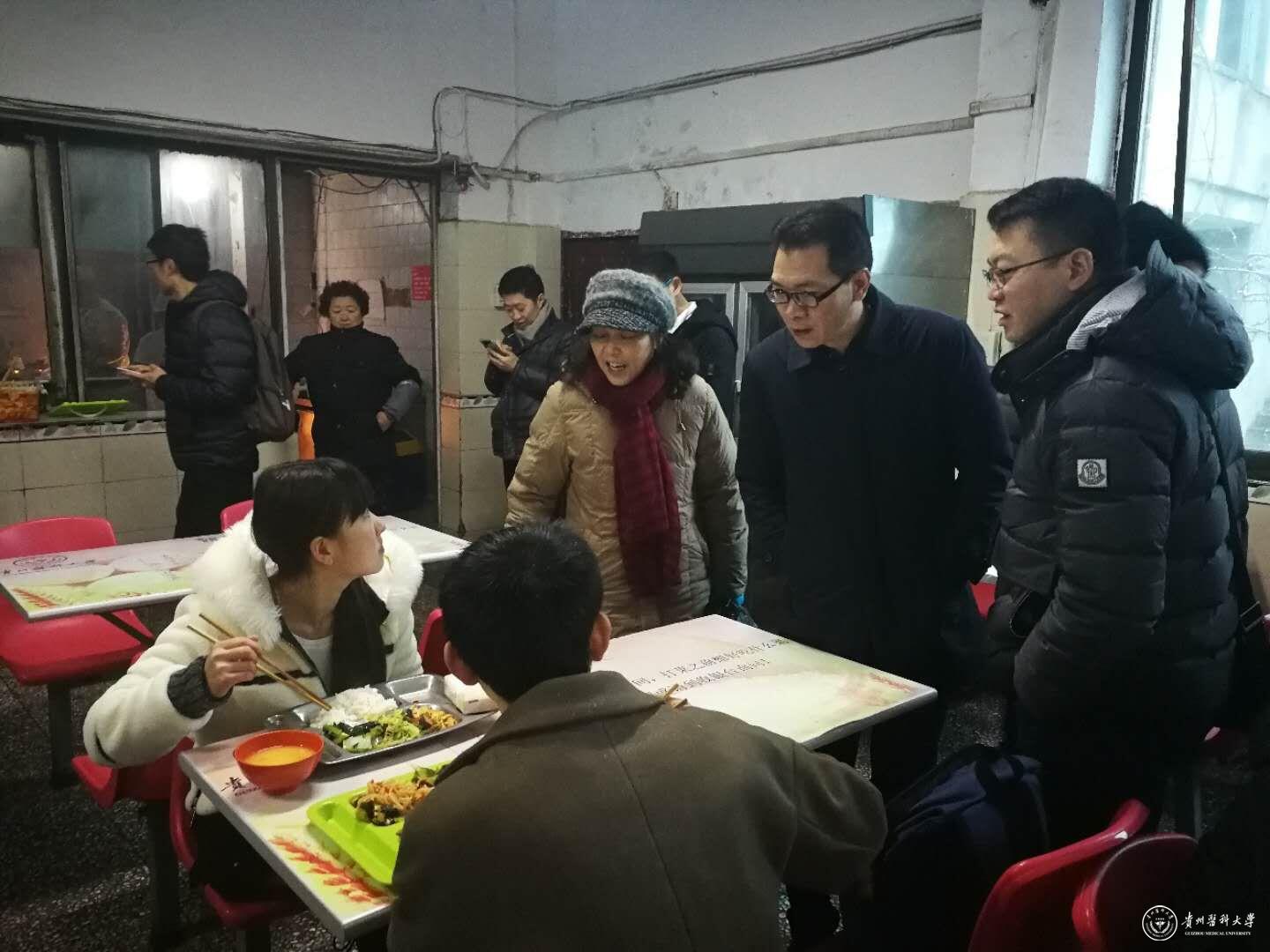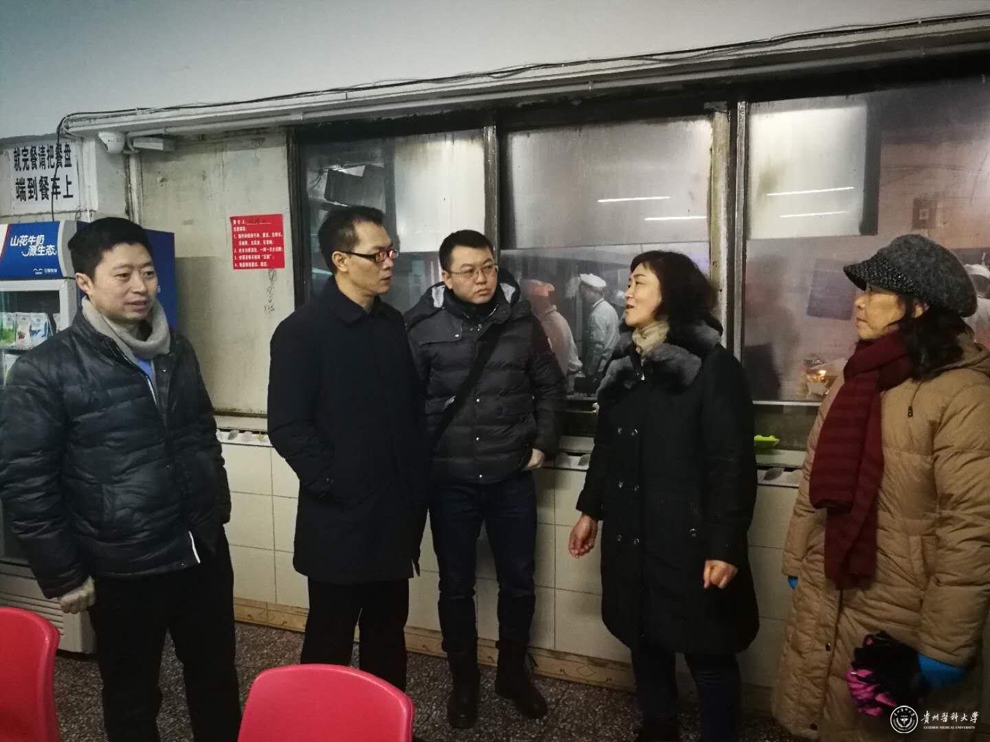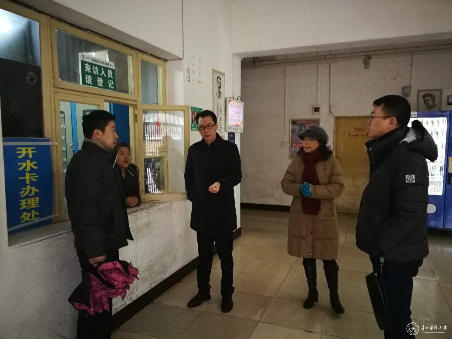 2月2日,副校长冉江舟带领保卫、基建、后勤、国资、研工部、学生处等部门冒雪对北校区学生宿舍、食堂等进行走访检查。