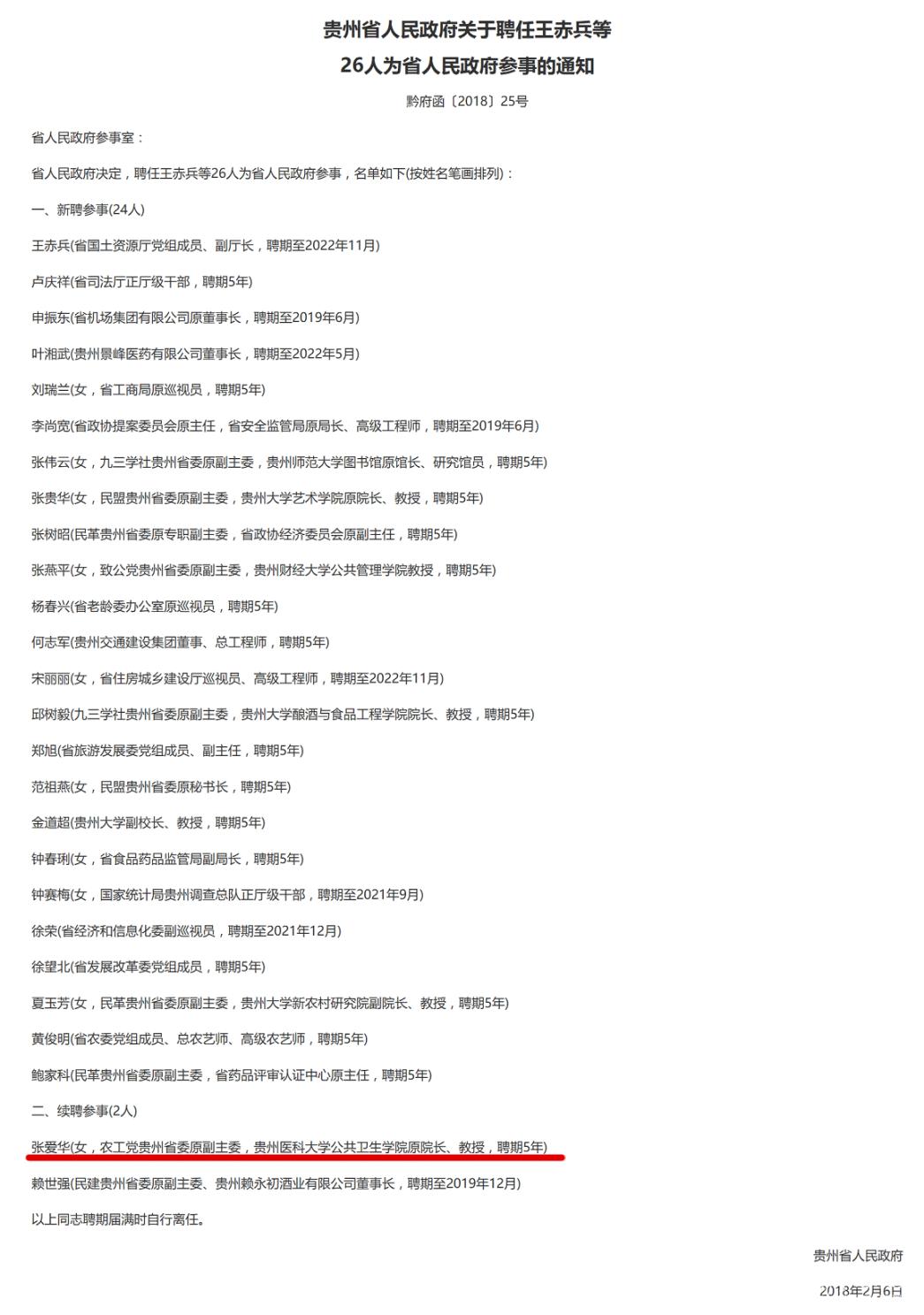 2月6日,贵州省人民政府发布《贵州省人民政府关于聘任王赤兵等26人为省人民政府参事的通知》(黔府函〔2018〕25号)。beat365环境污染与疾病监控教育部重点实验室主任、贵州省卫生发展研究院院长张爱华教授续聘为省人民政府参事,聘期5年。