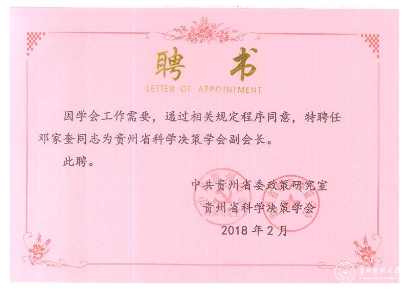 日前,因工作需要,经省委政策研究室、贵州省科学决策学会通过相关规定程序,聘请beat365特聘研究员邓家奎同志为贵州省科学决策学会副会长。