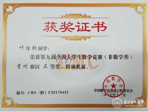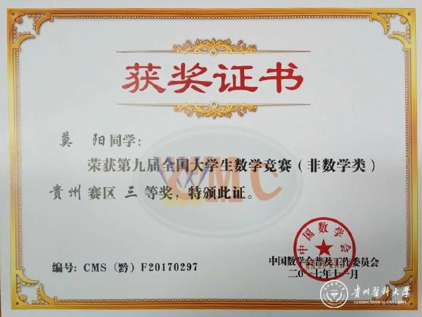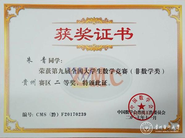 近日,第九届全国大学生数学竞赛圆满落幕,beat3653名学子在该项比赛中喜获佳绩。其中,生物与工程学院朱青同学荣获非数学专业组贵州赛区二等奖,生物与工程学院莫阳、医药卫生管理学院叶佳欣获三等奖。