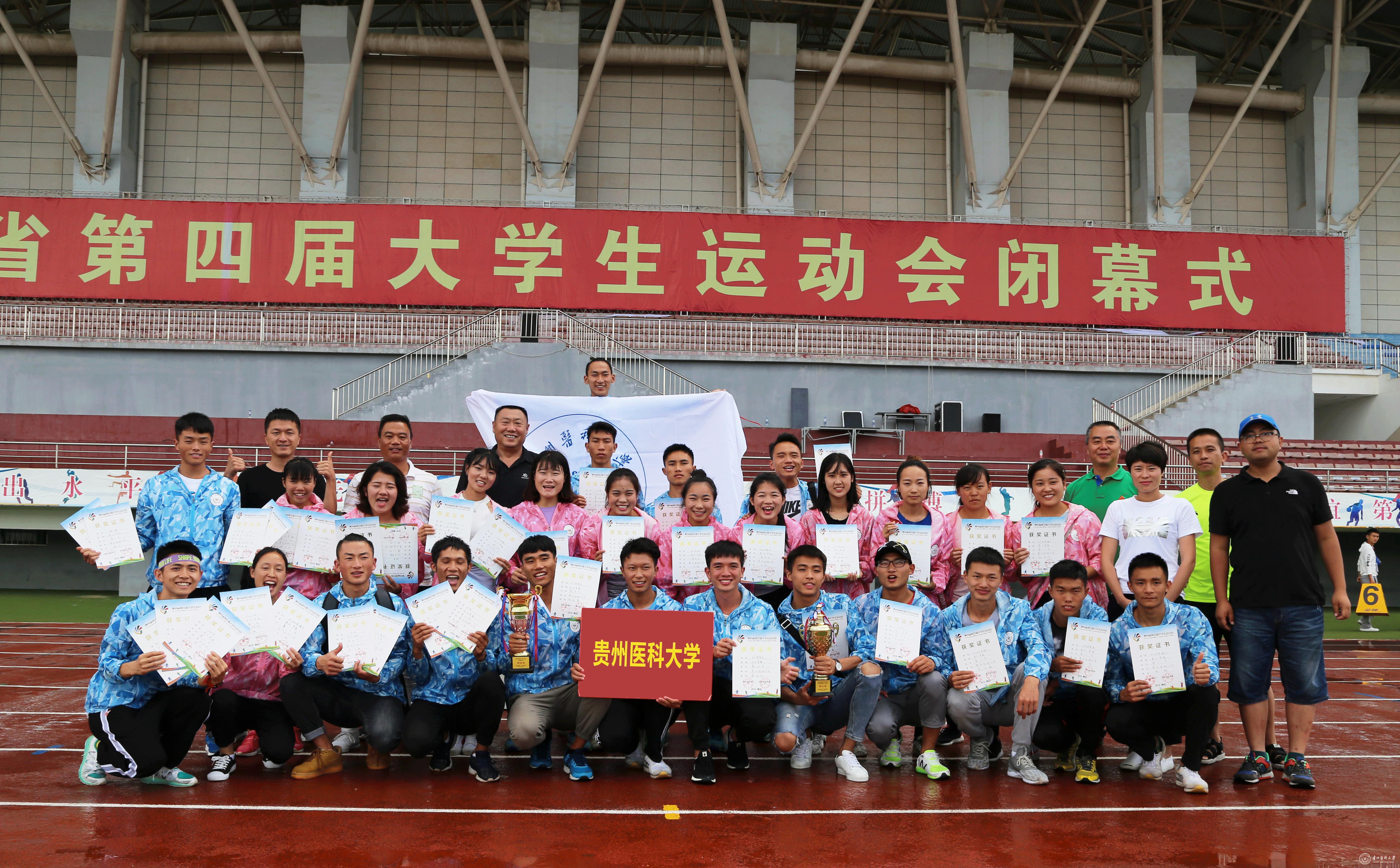 贵州省第四届大学生运动会是对近年来我省高校体育工作的一次全面检阅和集中展示,是强化学校体育工作和增强学生体质的重要举措。运动会设田径、篮球、足球、乒乓球、羽毛球5个大项,分甲组、乙组两个级别。在本次运动会赛场上,贵医健儿精诚团结,敢于拼搏,勇于超越,取得田径比赛团体第三,田径、足球、篮球、乒乓球、羽毛球五个项目团体总分第四名的历史最好成绩。