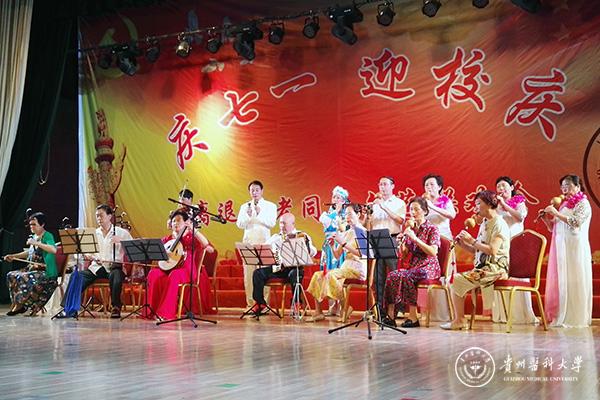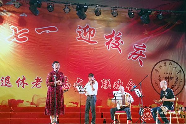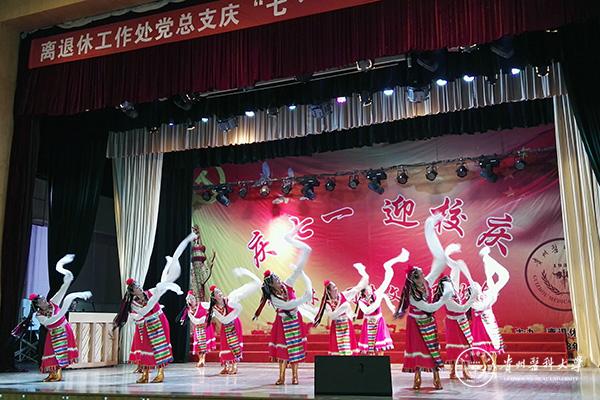 表彰会结束后举行文艺联欢会,由离退休党员、老科协、老年大学、退休教职工等自编自演的18个节目登台表演。老科协合唱团大合唱《不忘初心》、魅力舞蹈队《再唱山歌给党听》、老年大学乐器班演奏《军中绿花》、晚晴合唱团大合唱《校歌》、退休职工王丽萍独舞《女兵走在大街上》等形式多样的文艺节目。