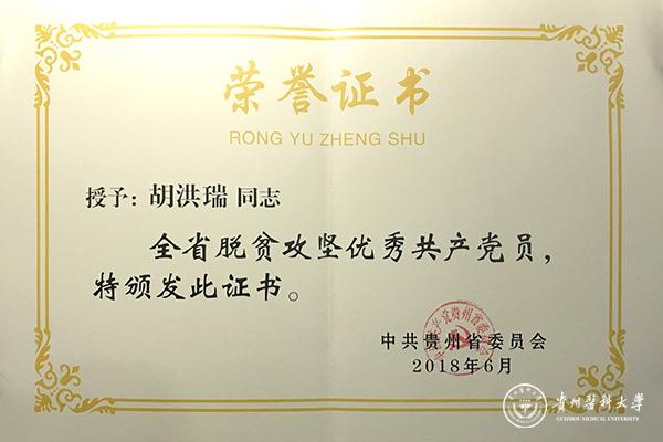 胡洪瑞同志自2015年7月至今,先后到铜仁市松桃县世昌乡金湾塘村和黔东南州三穗县款场乡良地村担任驻村干部、第一书记。工作中,以吃苦耐劳的韧劲、敢想敢干的冲劲团结带领贫困村党员群众强党建、兴产业、增收入、美环境,帮扶良地村集体产业从无到有、基础设施不断改善、群众满意度不断提升,2017年良地村在全县率先实现整村脱贫。胡洪瑞2016年被评为“省属高校系统优秀共产党员”,2017年被评为贵州省教育工委“优秀驻村干部”。