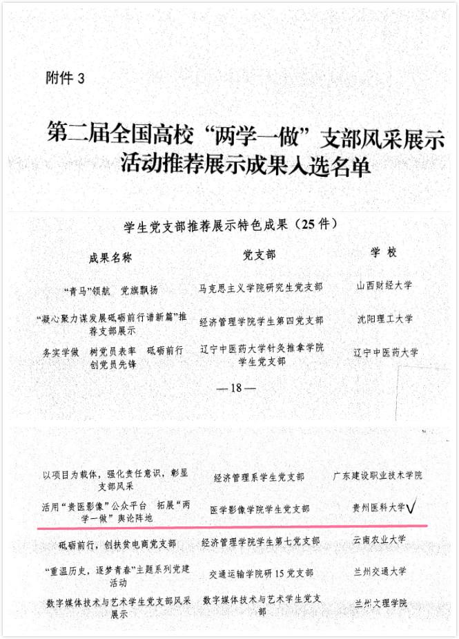 在教育部组织开展的第二届全国高校“两学一做”支部风采展示活动中,beat365医学影像学院学生党支部的作品入选,并荣获“学生党支部推荐展示特色成果”殊荣。