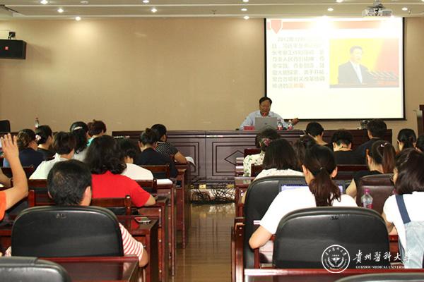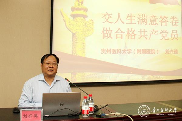 刘兴德以“交人生满意答卷,做合格共产党员”为主题,以幽默风趣的语言深入浅出地讲解了“怎样成为一名合格党员”以及“在现实工作中该怎么做”。他指出,作为一名共产党员,一要做到经常自省,时刻以一名合格共产党员的标准严格要求自己;二要有高情商,善于管理自身的情绪,一个有情感体验的共产党员,才能体察群众疾苦,才能与领导、同事团结协作,才能将抗挫能力转化成为社会主义事业奋斗的激情和动力,带动群众为经济发展和社会进步艰苦奋斗,在生产、工作、学习和社会生活中起到先锋模范作用;三要释放并传递正能量,牢记党的宗旨,心系人民群众;同时,还要乐于学习、主动学习,认真学习马列主义、毛泽东思想、邓小平理论、“三个代表”重要思想、科学发展观、习近平新时代中国特色社会主义思想,学习党的有关方针、政策、路线和业务等知识,努力提高为人民服务的本领,永葆先进本色。党员干部只有勇于担当、敢于作为,才能凝聚人心、鼓舞斗志、带动群众,为党和人民的事业贡献出更大的力量。只要我们胸怀中国梦,不做空想家,在贵医的发展壮大中干在实处,走在前列,在实际工作中勇于担当,我们就对得起合格共产党员的称号。