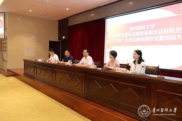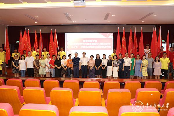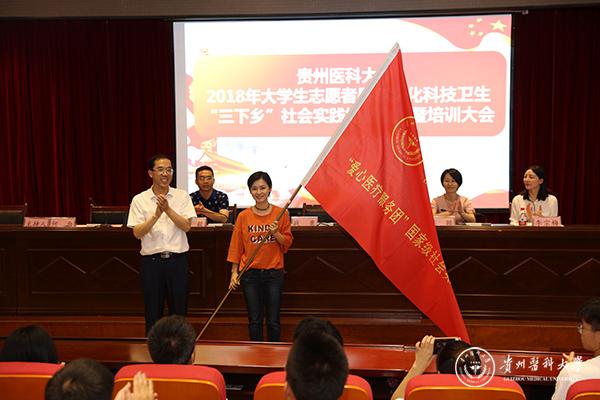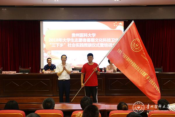 授旗仪式上,何为介绍了今年暑期“三下乡”社会实践工作安排情况。社会实践活动紧紧围绕“青春大学习 奋斗新时代”主题开展,继续采取点、面结合的方式,以点带面组织开展既有深度、又有广度的系列活动。校团委共组织国家级、省级、校级等二十一支分队在贵州各地开展以“乡村振兴”、“圆爱行动”、“送医送药”等形式多样的科技文化卫生“三下乡”社会活动。