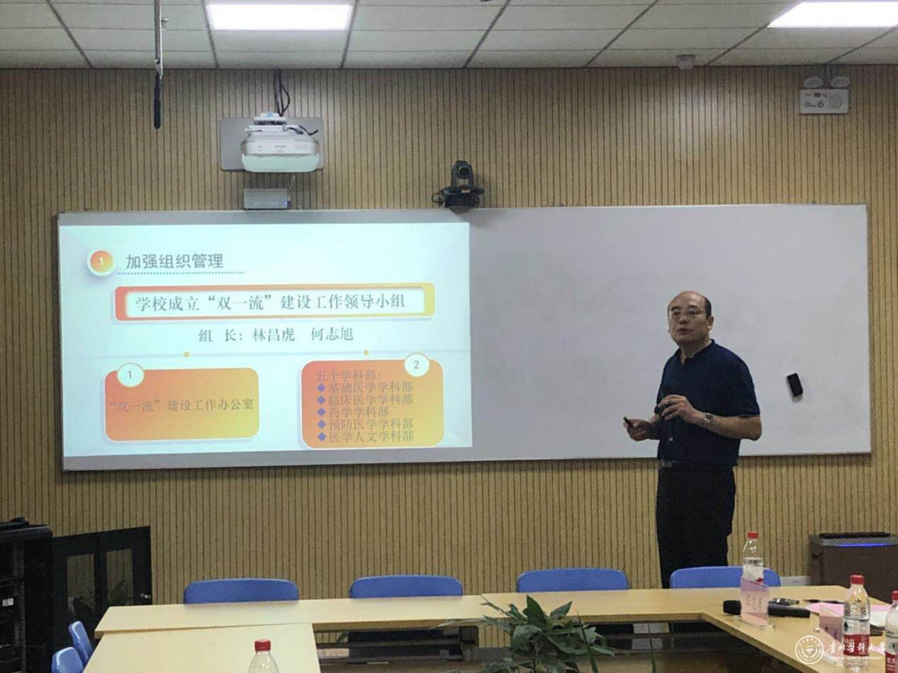 温小军就学校一流大学相关项目总体实施情况进行了汇报,特别强调在学校党委的支持下,“双一流”建设工作办公室和五个学科部(即基础医学学科部、临床医学学科部、药学学科部、医学人文学科部),有序、高效地组织实施各项工作计划,提升学校发展水平、增强学校核心竞争力。四个一流专业负责人临床医学院常务副院长孙发、药学院院长沈祥春、口腔医学院副院长王永、公共卫生学院营养与食品卫生学系副主任魏绍峰分别就相关专业建设情况进行了汇报。