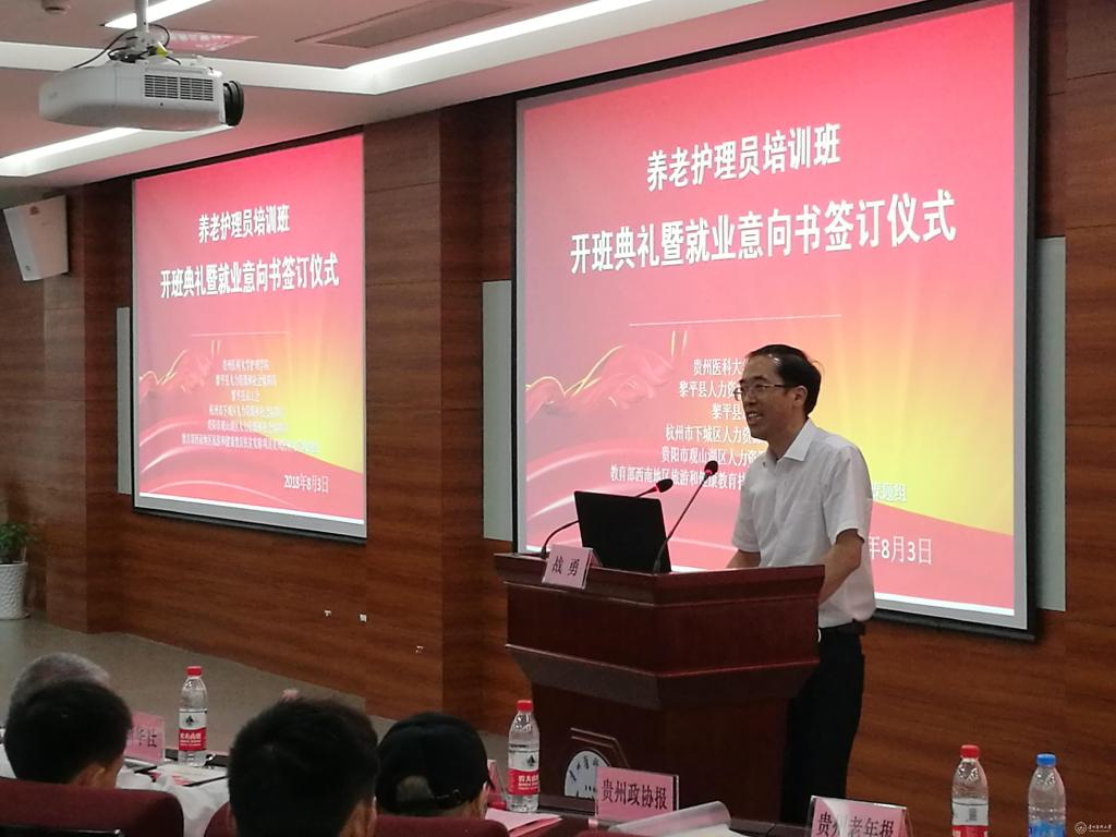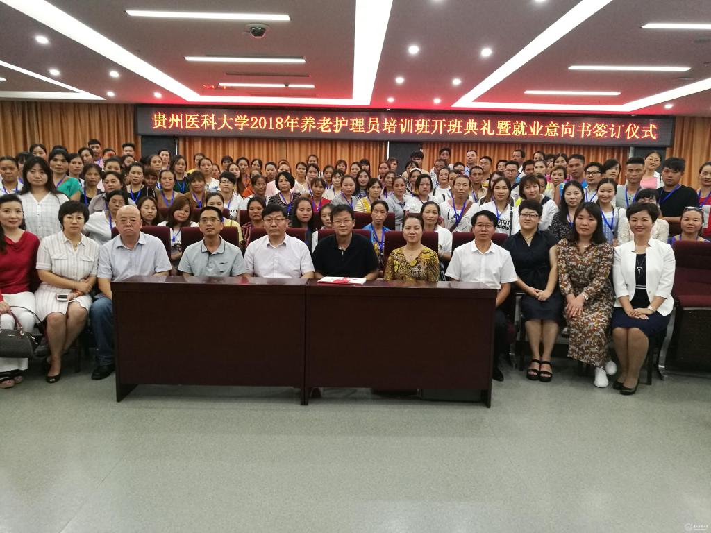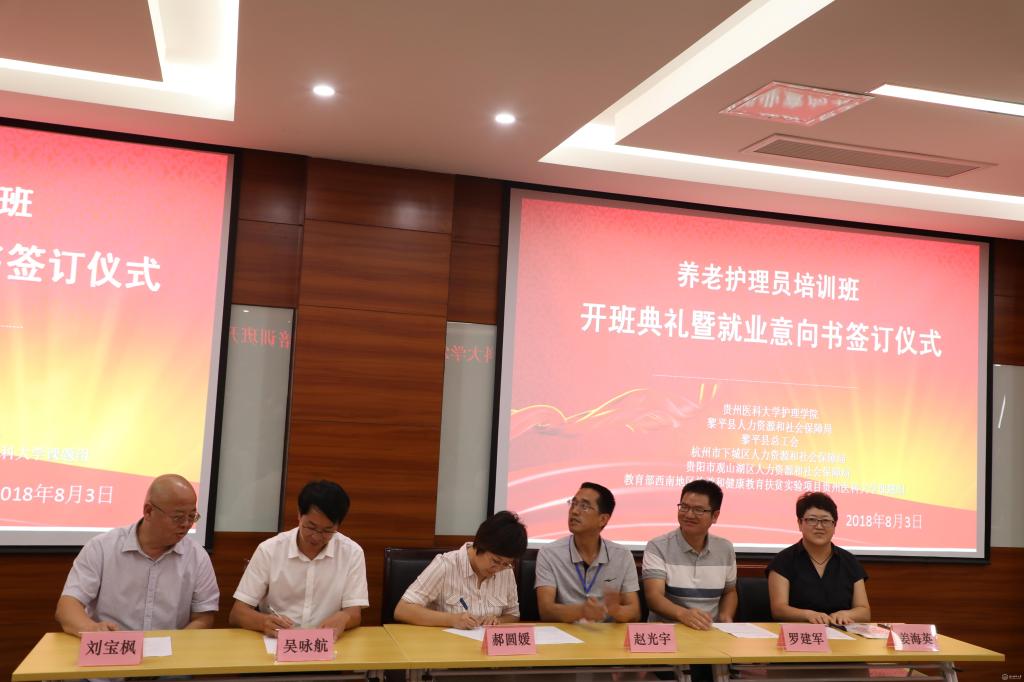 8月3日,beat365在北校区临床技能中心207会议室举行2018年养老护理员培训班开班典礼暨就业意向书签订仪式,培训班由护理学院与黎平县人力资源和社会保障局、黎平县总工会、浙江省杭州市下城区人力资源和社会保障局、贵阳市观山湖区人力资源和社会保障局联合举办。校党委副书记战勇、中国红十字总会发展中心、北京曜阳养老服务中心、北京儆堂集养老中心、贵阳曜阳养老服务中心等用人单位负责人出席,护理学院及相关部门负责人参加,开班典礼由护理学院教学科研管理科科长王秀红主持。