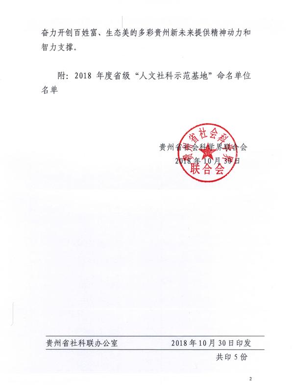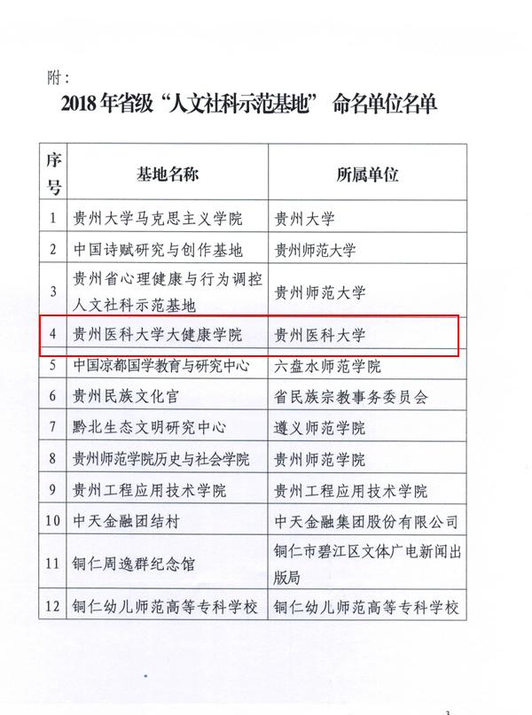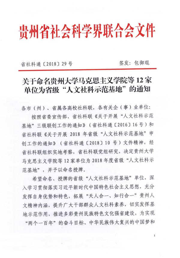 近日,贵州省社会科学界联合会发布《关于命名贵州大学马克思主义学院等12家单位为省级“人文社科示范基地”的通知》(省社科通〔2018〕29号),公布2018年度省级“人文社科示范基地”命名单位名单,beat365大健康学院成功入选。