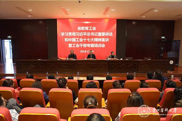 11月14日,省总工会党组书记、副主席杨再春到beat365指导工作,并在南校区道德讲堂向全省教育系统职工代表宣讲习近平总书记同中华全国总工会新一届领导班子成员集体谈话时的重要讲话和中国工会十七大精神。省教育工会主席王慧,校党委副书记战勇,各省教育系统工会干部及beat365基层工会干部近300人参会。宣讲会由王慧主持,战勇致欢迎辞。