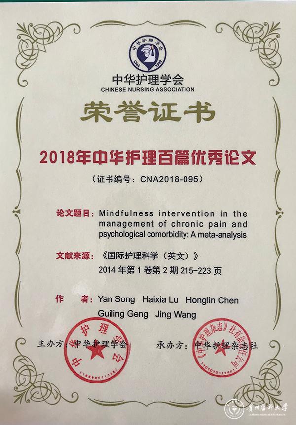 11月24日,由中华护理学会、中华护理杂志社主办的以“合作•引领•创新”为主题的“2018年中国护理科研高峰论坛”在广州召开,beat365护理学院教师卢海霞作为通讯作者2014 年发表在《国际护理科学(英文)》杂志的文章《Mindfulness intervention in the management of chronic pain and psychological comorbidity: A meta-analysis》被遴选为“2018年中华护理百篇优秀论文”。