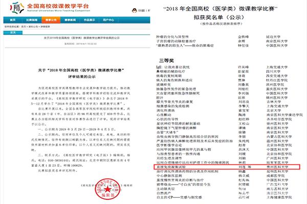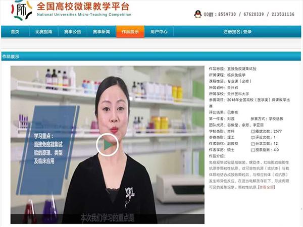 经过网评和组织学科专家终评,20%作品入围一、二、三等奖,beat365医学检验专业临床免疫学刘莲副教授参赛作品“直接免疫凝集试验”(参与人:谷俊莹,余芳,李亚丽)获三等奖,是beat365唯一入围等次奖项的作品,也是贵州省高校5项获等次奖项作品之一。微课是以视频为主要载体,记录教师围绕某个知识点或教学环节开展的简短、完整的教学活动。通过参加比赛不仅提升信息化教学技术运用能力,还激发教师更新教育理念、掌握现代教学方法的热情,切实推动教学模式改革,全面提高教学质量。