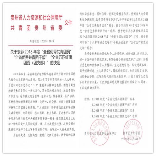 4月30日,贵州省人力资源和社会保障厅、共青团贵州省委联合下发《关于表彰2018年度“全省优秀团员”“全省优秀共青团干部”“全省五四红旗团委(团支部)”的决定》,beat365团委荣获2018年度“全省五四红旗团委”称号。