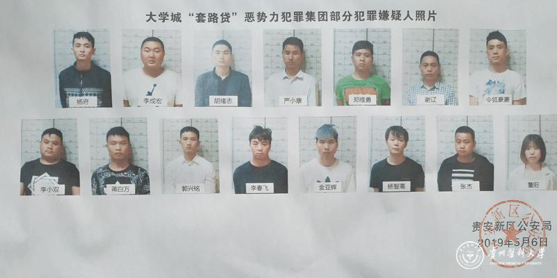 经公安机关依法查证,杨府、郭兴铭等15人“套路贷”恶势力犯罪集团,在大学城区域以网络贷款、面签贷款等方式,主要面向在校大学生实施非法放贷,通过故意制造违约、恶意垒高债务,采取电话滋扰、非法拘禁、故意伤害、暴力威逼恐吓等手段实施追债,已致部分学生退学。为彻底查清该犯罪集团的违法犯罪事实,保障广大师生的生命财产安全,请广大师生积极检举揭发该犯罪团伙的违法犯罪事实,公安机关将安排专人接受举报。对举报线索一经查实,公安机关将根据《贵安新区扫黑除恶专项斗争举报奖励办法(试行)》规定,对举报人给予最高可达50000.00元的奖励。