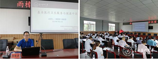 此次系列活动中,beat365杨敬源副教授作了题为《基本医疗卫生服务与健康中国》的专题讲座,围绕基本医疗卫生服务与健康中国的概念、内涵、发展及科学意义进行了系统讲解。同时,聚焦健康中国和健康共治,分析了基层医疗机构在健康中国建设中的价值和意义,激励基层医疗机构人员要努力做好基本医疗卫生服务,为提高当地居民健康水平做出贡献。该讲座得到了雨樟镇中心卫生院全体职工、村医以及其他基层干部等与会代表的充分肯定和好评。
