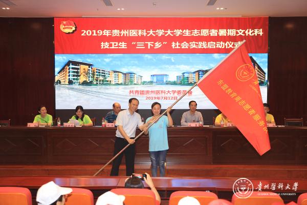 授旗仪式上,桂晓玲介绍了今年暑期“三下乡”社会实践工作安排情况。今年的社会实践活动紧紧围绕“青春心向党·建功新时代”主题开展,活动将继续采取点、面结合的方式,以点带面组织开展既有深度、又有广度的系列活动。校团委共组织国家级、省级、校级等二十六支队伍,其中国家级重点服务团队4支,“健康扶贫青春行”国家专项团队2支,省级专项计划及重点团队7支,校级重点团队13支。