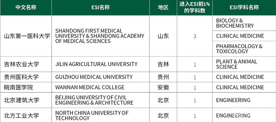 2019年9月新进入ESI前1%行列的中国大陆高校及学科