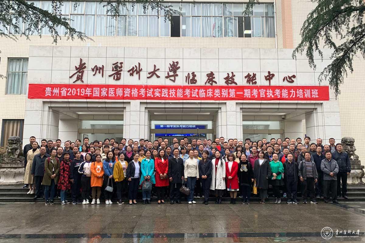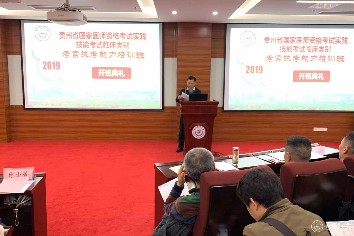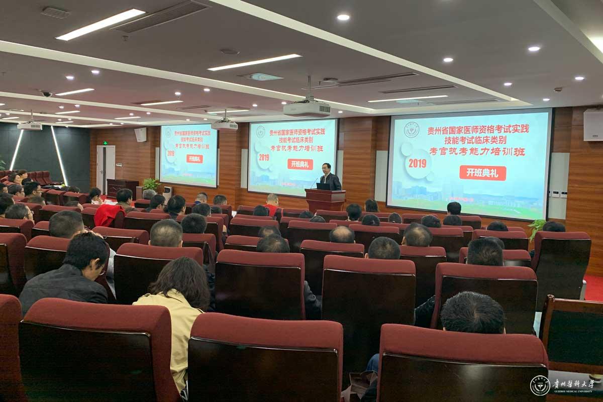 10月21日,2019年贵州考区国家执业医师资格考试实践技能考试考官(临床)执考能力提升培训班开班典礼在临床技能中心举行,来自贵州各市州的121名考官参加本次培训。贵州省卫生人才交流考试培训中心副主任邹鸣、考务科周霓,beat365唯一官方网站党委委员、附属医院院长、临床医学院院长李海洋,临床医学院副院长艾戎、临床技能中心主任田静文,贵州省首席考官曾小菁等人出席临床医学院党委书记周红主持开班典礼。