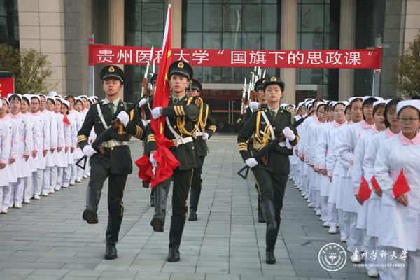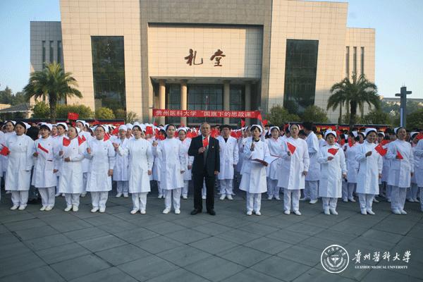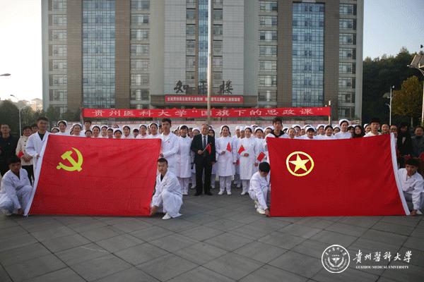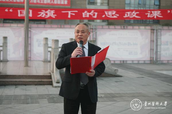 升旗仪式结束后,田晓滨回顾了党带领人民艰苦奋斗、自力更生的历史,分析了新中国在短时间内发生改天换地巨大变化的原因。他指出: 70年来,党带领全国人民始终坚持走自己的路,经过长期探索和实践,开创和发展中国特色社会主义,从根本上改变了中国人民和中华民族的前途命运。我们的祖国从来没有像今天这样欣欣向荣、蒸蒸日上,我们的民族从来没有像今天这样扬眉吐气、自信满怀,我们的人民从来没有像今天这样幸福安康、意气风发。他谈到:建校以来,学校始终秉承“诚於己,忠于群,敬往思来”的校训,坚持“文化建校、质量立校、人才强校、科研兴校”的办学理念,在贵医精神的感召下,学校的各项事业取得了长足的进步,实现了跨越式发展。作为贵医人,我们责任重大、使命光荣,所以每个人都应把个人发展与学校的事业和祖国的命运紧密结合起来,为学校的发展、祖国的繁荣做出应有的贡献。