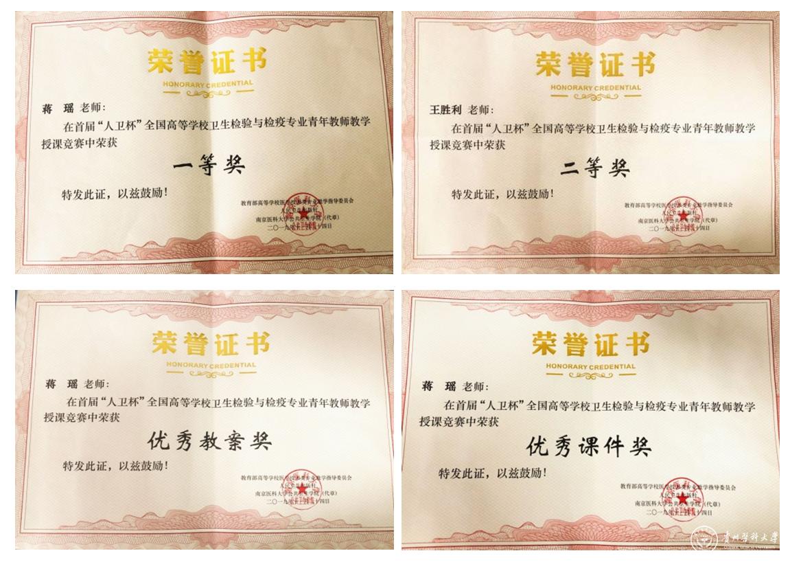 首届“人卫杯”全国高等学校卫生检验与检疫专业青年教师教学授课竞赛得到教育部高校医学技术教指委的高度重视和50所举办卫生检验与检疫专业高校的热烈响应,共有29支代表队54名老师报名参赛,21所院校前往现场观摩。beat365参赛队由公共卫生学院副院长李军领队。在为期一天半的比赛中,参赛教师根据精心设计的教案和制作精美的课件做了讲课,展现出了良好的精神风貌和较高的授课水平。最终,蒋瑶获微生物检验组教学授课一等奖、王胜利获理化检验组教学授课二等奖,另外蒋瑶还获得优秀课件奖和优秀教案奖。
