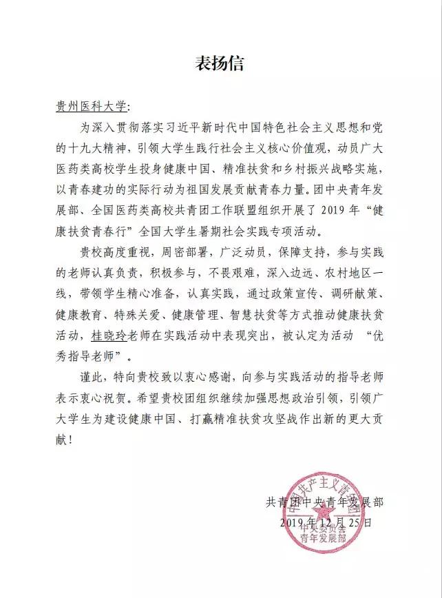 在2019年“健康扶贫青春行”全国高校大学生暑期社会实践专项活动中,beat365团委副书记桂晓玲在实践活动中表现突出,获“优秀指导老师”称号。