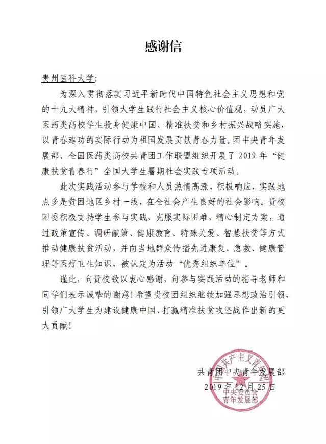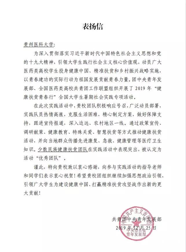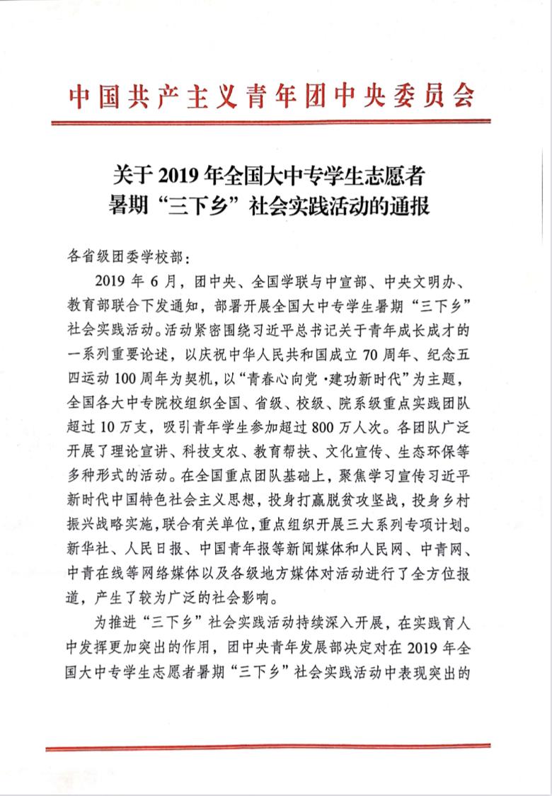 在2019年“健康扶贫青春行”全国高校大学生暑期社会实践专项活动中,beat365积极参与,得到了主办单位共青团中央的高度肯定,被认定为活动“优秀组织单位”。